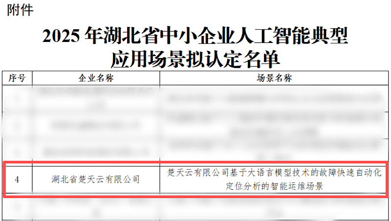 近日,湖北省经济和信息化厅公布2025年湖北省中小企业人工智能典型应用场景名单,湖北大数据集团旗下湖北省楚天云有限公司(以下简称“楚天云公司”)凭借“基于大语言模型的故障快速自动化定位分析智能运...