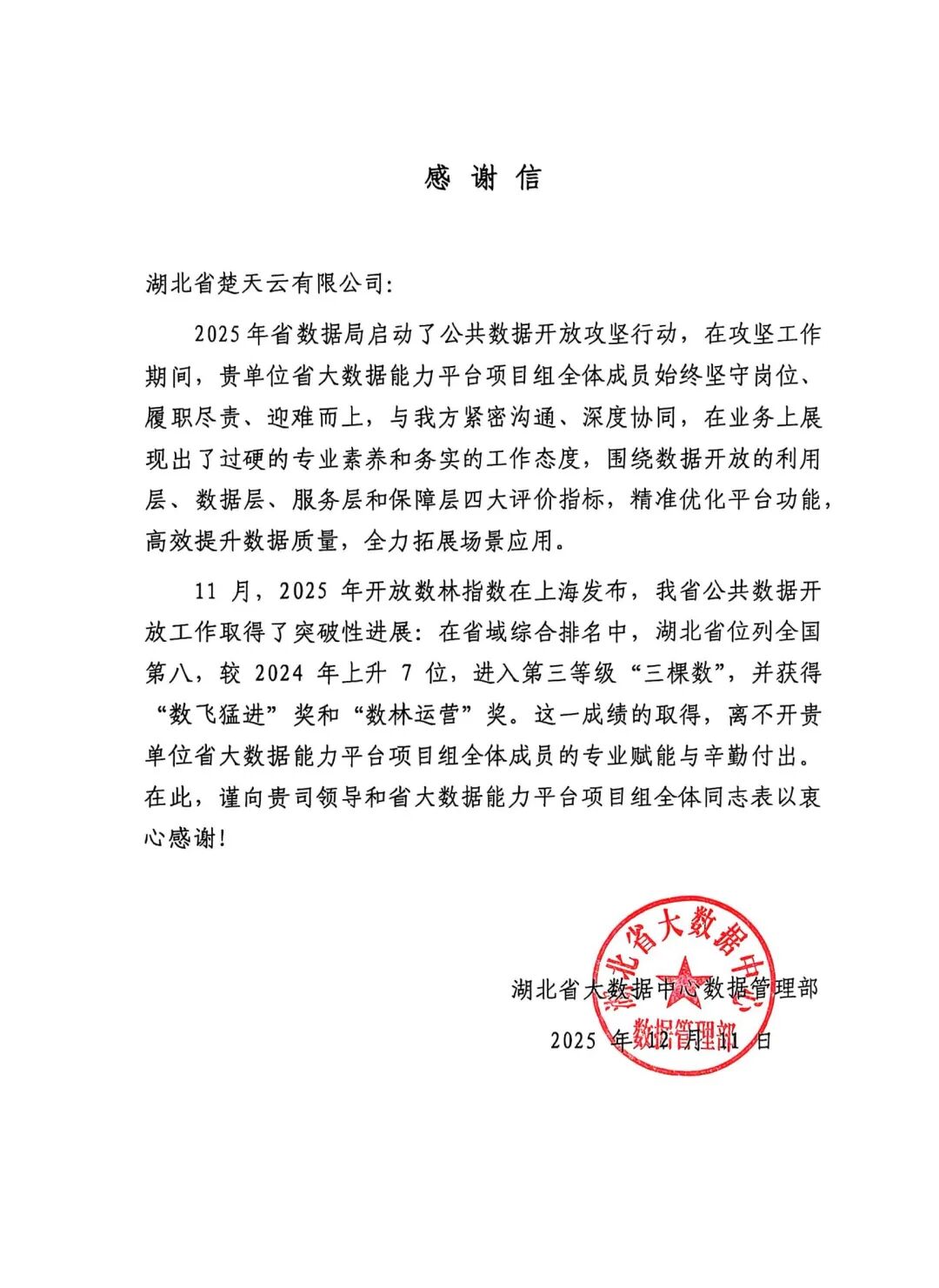 2025年省数据局启动了公共数据开放攻坚行动,在攻坚工作期间,楚天云公司省大数据能力平台项目组全体成员始终坚守岗位、履职尽责、迎难而上,与省数据局及省大数据中心紧密沟通、深度协同,在业务上展现出了过硬的专业素养和务实的工作态度,围绕数据开放的利用层、数据层、服务层和保障层四大评价指标,精准优化平台功能,高效提升数据质量,全力拓展场景应用,助力我省公共数据开放工作取得了突破性进展:在省域综合排名中,湖北省位列全国第八,较2024年上升7位,进入第三等级"三棵数",并获得"数飞猛进"奖和"数林运营"奖。楚天云公司将继续利用专业技术为我省数据开放发挥更大作用!