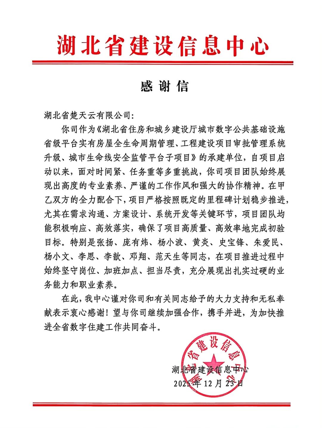 楚天云公司作为《湖北省住房和城乡建设厅城市数字公共基础设施省级平台实有房屋全生命周期管理、工程建设项目审批管理系统升级、城市生命线安全监管平台子项目》的承建单位,面对时间紧、任务重等多重挑战,楚天云公司项目团队始终展现出高度的专业素养、严谨的工作作风和强大的协作精神。在双方的全力配合下,项目严格按照既定的里程碑计划稳步推进,尤其在需求沟通、方案设计、系统开发等关键环节,项目团队均能积极响应、高效落实,确保了项目高质量、高效率地完成初验目标。在项目推进过程中始终坚守岗位、加班加点、担当尽责,充分展现出扎实过硬的业务能力和职业素养。未来,楚天云公司将继续与省住建厅携手并进,为加快推进全省数字住建工作共同奋斗。
