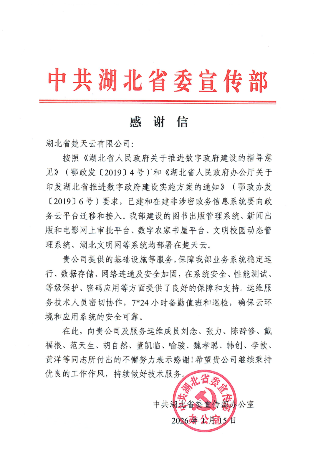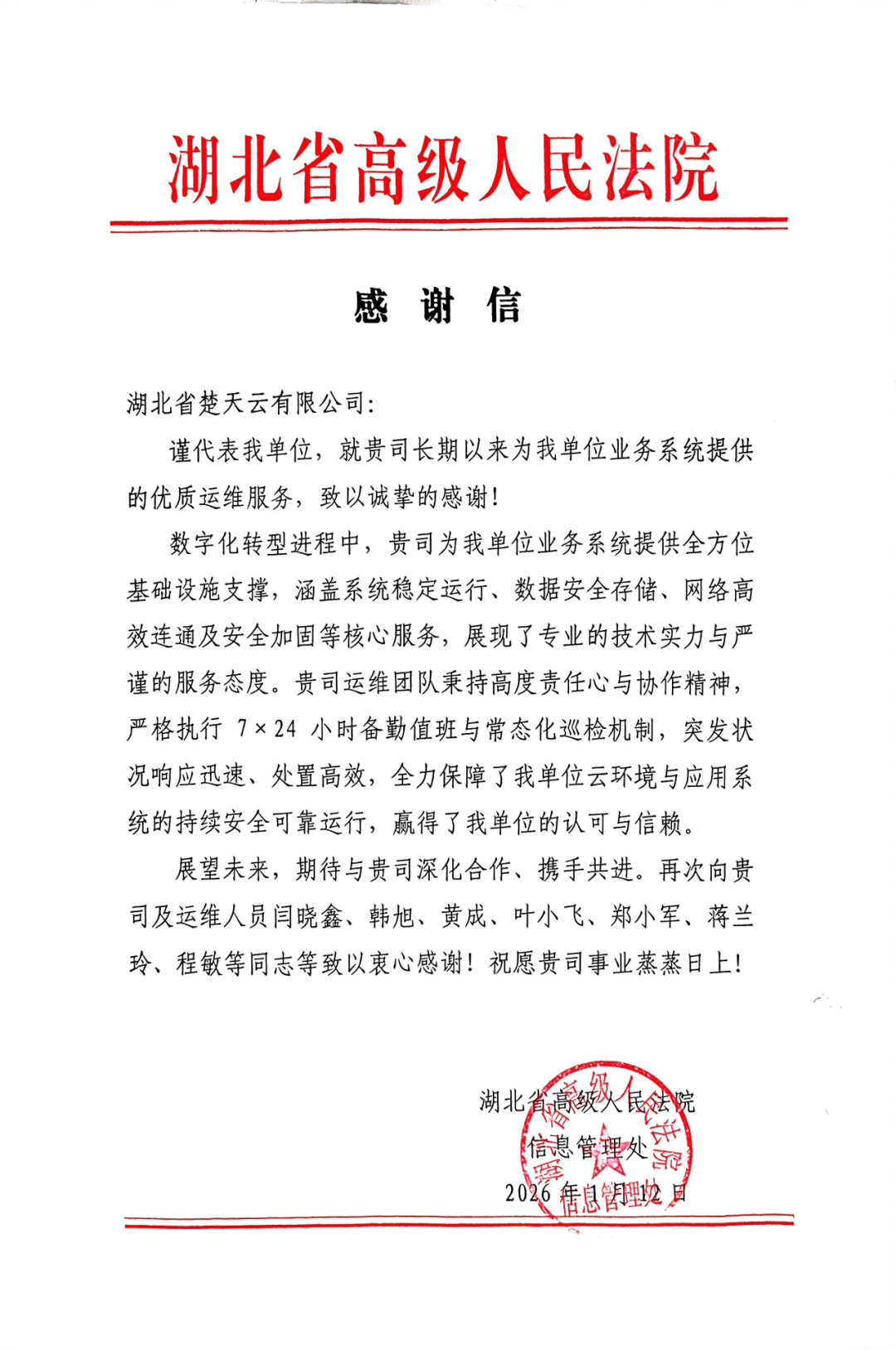 近日,楚天云公司陆续收到来自政府相关部门、企事业单位的70余封感谢信和表扬信,诉说着楚天云公司项目团队的专业技术和优质服务。逐封展信、逐字读情,让纸上的谢意成为脚下的动力,将收获的荣耀化作前进的号角。2026年,楚天云公司将继续以扎实的技术实力以及良好的工作作风,不负每一封期待!