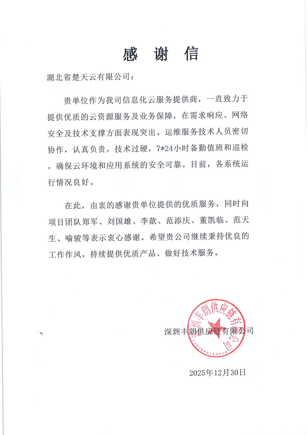 楚天云公司作为深圳丰朗供应链有限公司的信息化云服务提供商,一直致力于提供优质的云资源服务及业务保障,在需求响应、网络安全及技术支撑方面表现突出。公司运维服务技术人员密切协作,认真负责,技术过硬,不间断值守和常态化巡检,确保云环境和应用系统的安全可靠。楚天云公司将继续秉持优良的工作作风,持续提供优质产品、做好技术服务。