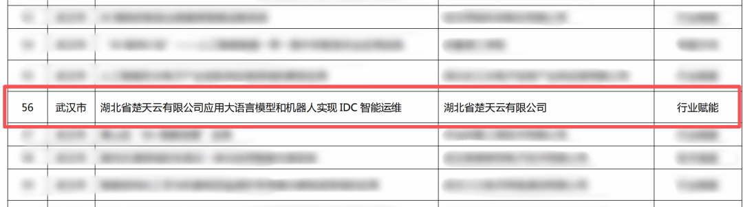 近日,湖北省经济和信息化厅公示《2026年湖北省人工智能典型应用场景》,湖北大数据集团旗下湖北省楚天云有限公司(以下简称“楚天云公司”)申报的“应用大语言模型和机器人实现IDC智能运维”场景成功入选。