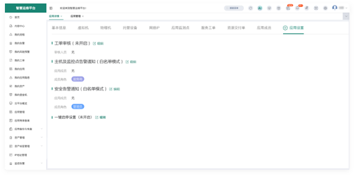 支持用户根据自己业务需要进行工单审批、主机及监控点告警通知、安全告警通知设置和一键启停等。