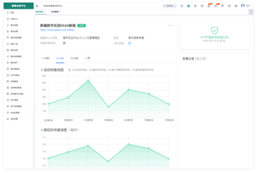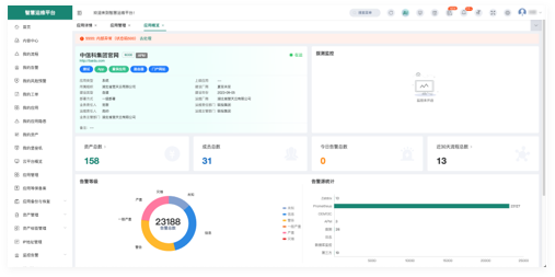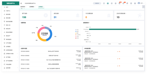 支持对应用相关数据提供图形化统计与展示,包括:组织信息、拨测监控、资产总数、成员总数、今日告警总数、30天流程总数、告警等级、告警源统计、处理中流程、未恢复告警等。