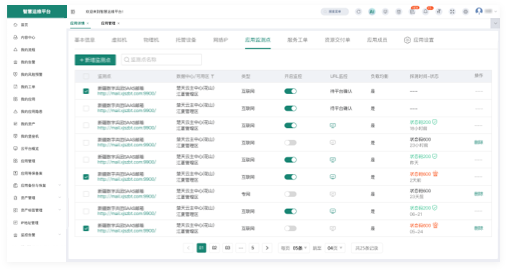 支持根据监测点的处置结果筛选监控点,支持查询并展示监测点信息,包括:监测点名称、启用状态、探测结果、应用名称、所属组织、监测点类型、所在数据中心、所属区域、访问URL、IP和端口、创建时间、创建者等,支持同步确认和更新监测点数据。支持查看监测点详细信息,包括:返回曲线码和响应时间曲线。