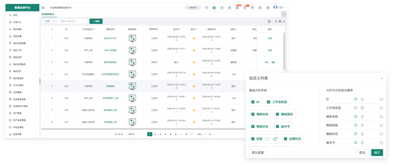 记录流程模板的具体信息包括ID、工作流类型、模板名称、模板图标、模板状态、版本号、创建时间等信息,支持自定义显示字段,支持增删改查流程模板。