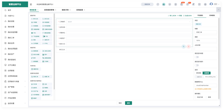 提供可视化的编辑工具,内置30+组件,支持用户通过拖放组件来设计流程表单,简化模板的创建过程。