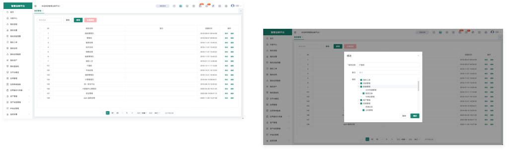 支持根据实际业务及流程定义平台所需要的角色,为其授权相应的菜单操作权利,平台内置10+角色,支持角色的增删改查。