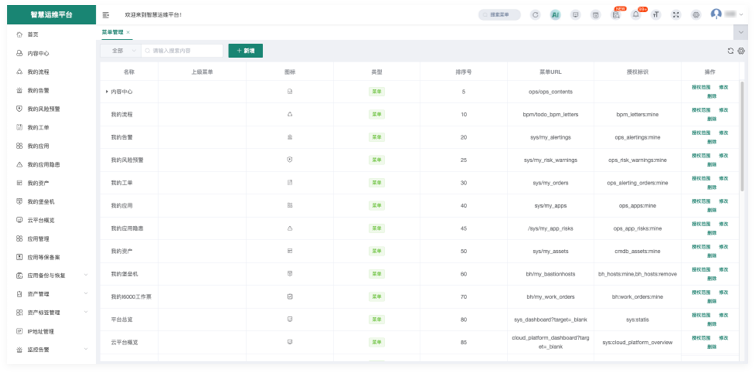 支持对整套平台的菜单进行统一管理,列表项展示菜单关系、图标、类型、排序号、菜单URL、授权标识等;支持修改各项菜单的授权范围;支持新增菜单或对已有菜单进行修改和删除。